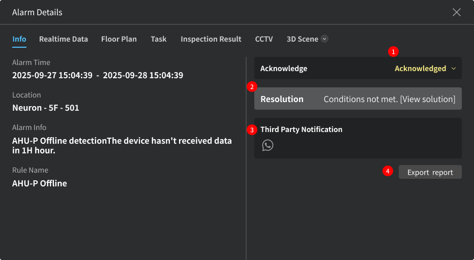Displays alarm handling, with the following three statuses: (1) Unresolved: Newly generated alarms that have not been handled; at least one action (such as filling in inspection results, creating and closing a work order, or sending a third-party notification) must be completed to mark the alarm as "Resolved".
