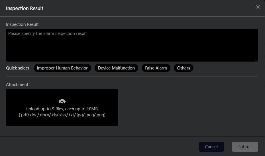(2) In Progress: The user has completed one of the actions "filling in inspection results, creating and closing a work order, or sending a third-party notification". Clicking again will mark the alarm as "Resolved".