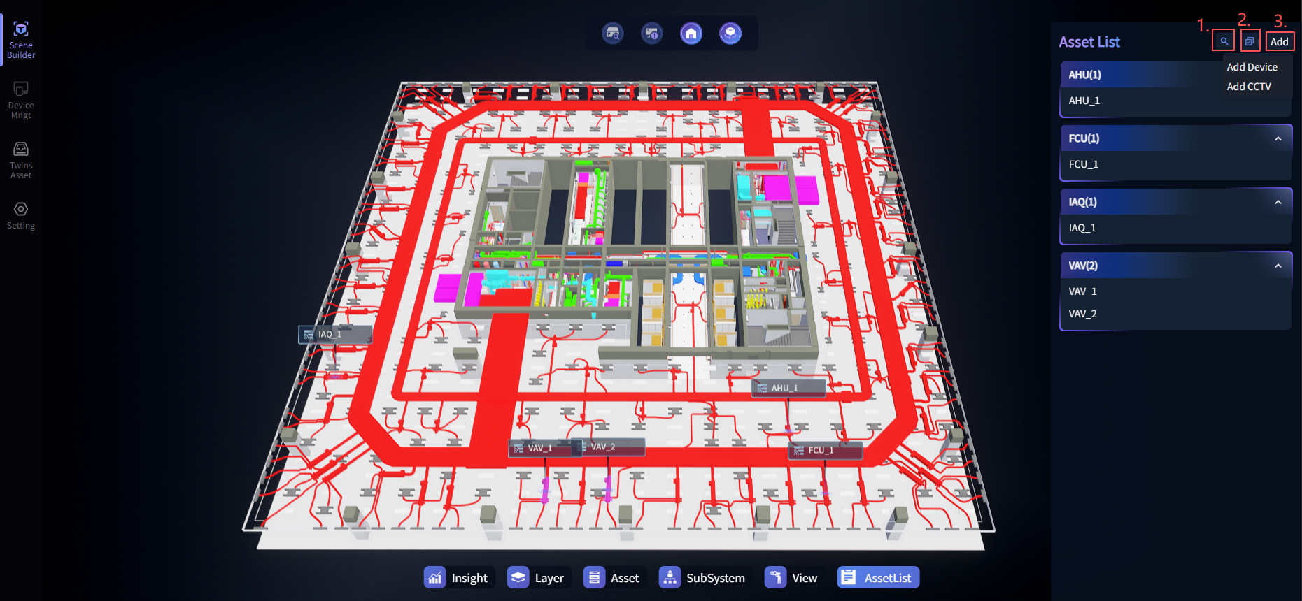 Note: Each sub-scene can independently define model binding relationships, interaction logic (e.g., Hotkeys), and data display content (e.g., real-time device points and digital asset information), achieving synchronization and linkage between virtual models and physical entities at the status, asset, and spatial levels.