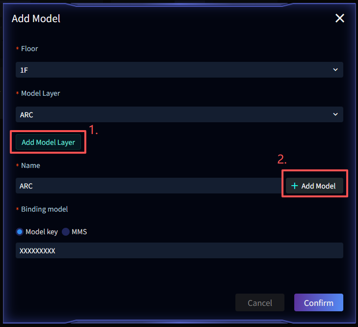 Model Key format is typically used for System or Floor scene models. Find the scene needing a model in the scene list, click the top-right More -> Add Model, open the Add Model interface, and fill in Model Floor, Model Name & Layer, Model Key (Model Binding Type must be set to Model Key).