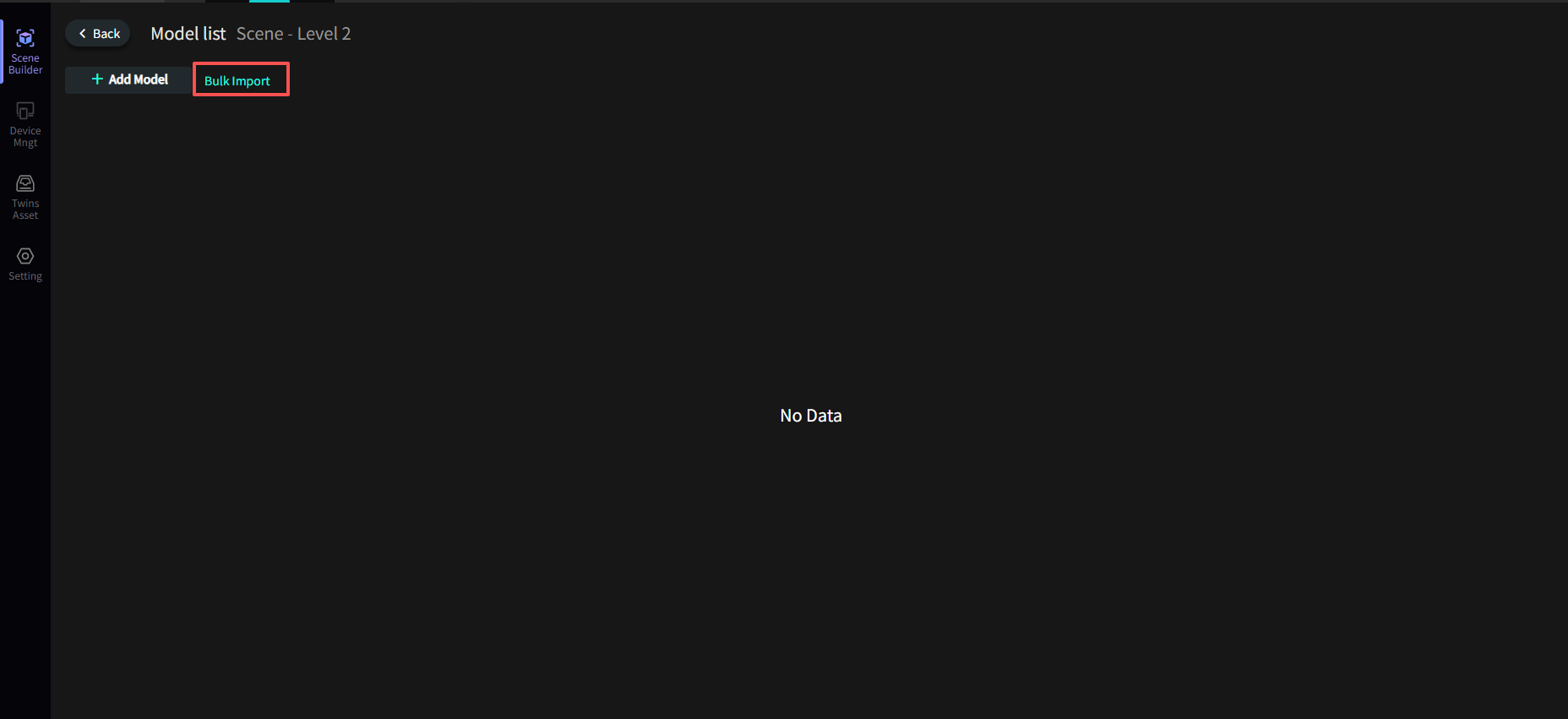 Select the target scene in the Scene Panel, click the scene image to enter the model list, and perform the bulk import operation.