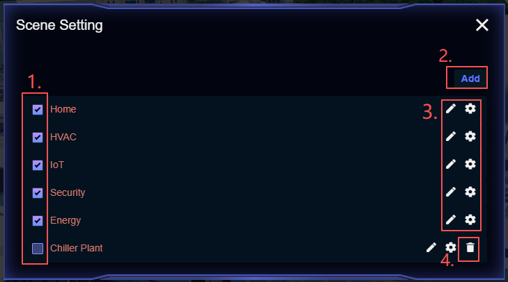 This function is suitable for configuring independent sub-scenes by different business dimensions within a unified model scene, e.g., setting the building's energy status, parking lot, elevator operation, CCTV, etc., as separate sub-scenes. Each sub-scene can have its own dedicated Dashboard, helping users focus on specific issues and enabling independent viewing and management per scene. - Add Sub-scene;