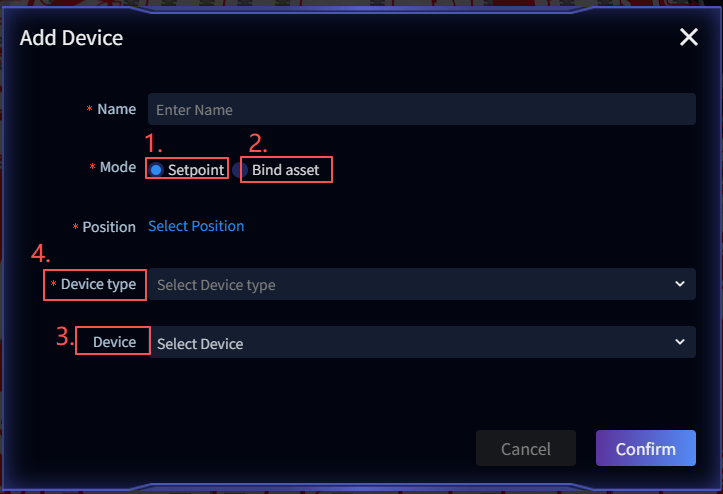 Define the asset device name, choose the addition method 1. Add Point or 2. Bind Asset, click 4. Device Type Dropdown to view and select the device type, and bind device data to the asset via 3. Bind Device to see the device's real-time data.
