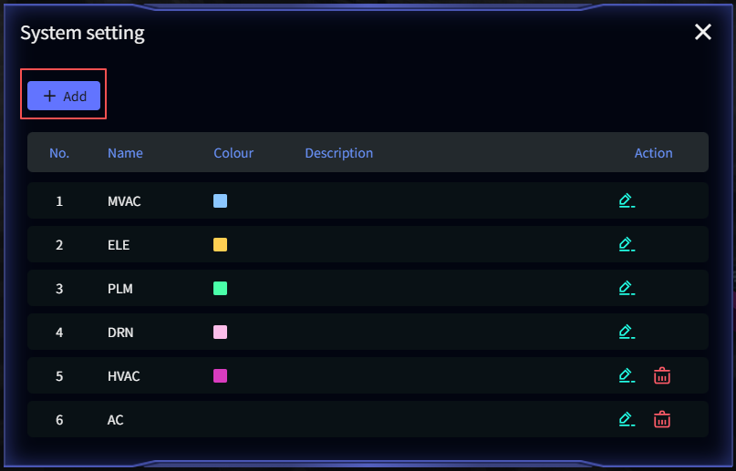 Device types must be pre-set before adding asset devices. Go to the left menu bar, click 【Settings】 -> 【Device Type Settings】, click the +Add button to add.