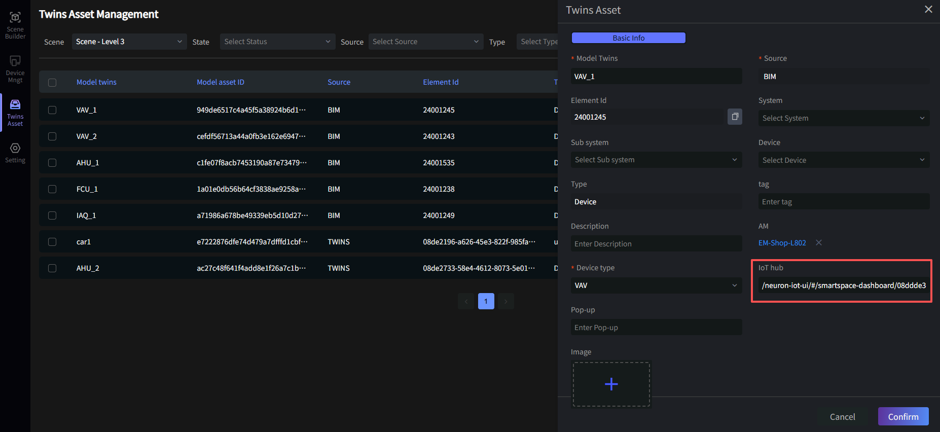 Edit the IoT Hub field in the edit page, paste the internal link of the dashboard page obtained from the IoT Hub application (see Dashboard Page Step 1 for details), and click Confirm.