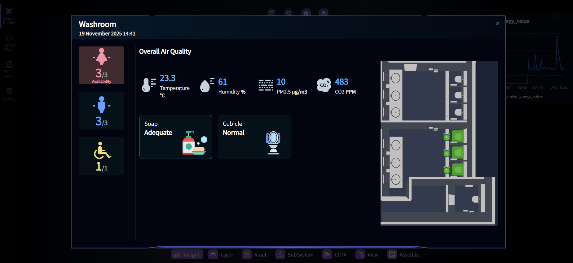 To view detailed asset information (including basic info, specification documents, maintenance records, work order status, etc.) in the 3D scene, the digital asset needs to be bound to the corresponding asset in the Asset Management (AM) module.