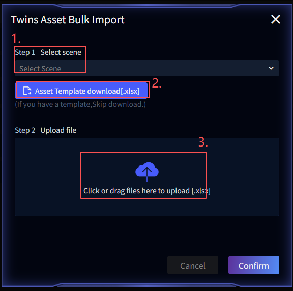 Before adding assets this way, you need to obtain the BIM model's Element Id to accurately locate the model. To do this, you can first export the empty assets not bound in the scene: 1. Select the scene, click 2. Download Empty Assets to get a file containing the Element Ids of BIM models at various levels.