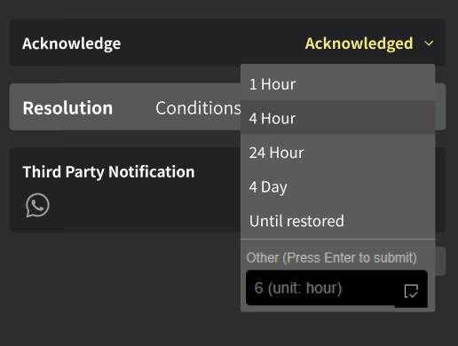 告警的确认日志: 点击 确认 则代表告警已被人员知晓并正在处理中, 再次点击可 取消确认。确认时可设置静默时长,在此期间即使设备持续告警,平台也不会重复提醒,但您仍可在告警列表中查看该记录。