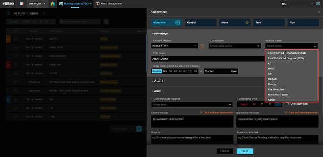 分析目标筛选:根据所设置的告警规则的分析目标(如下图)进行检索告警;详情可见规则设置。