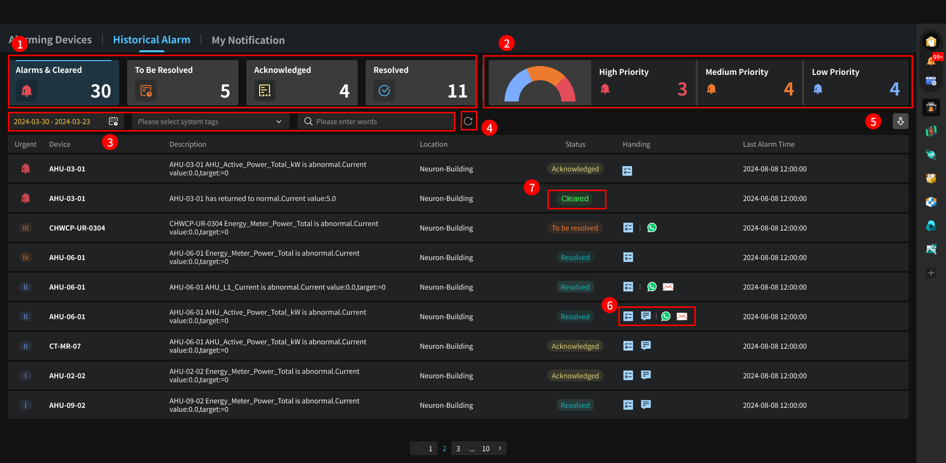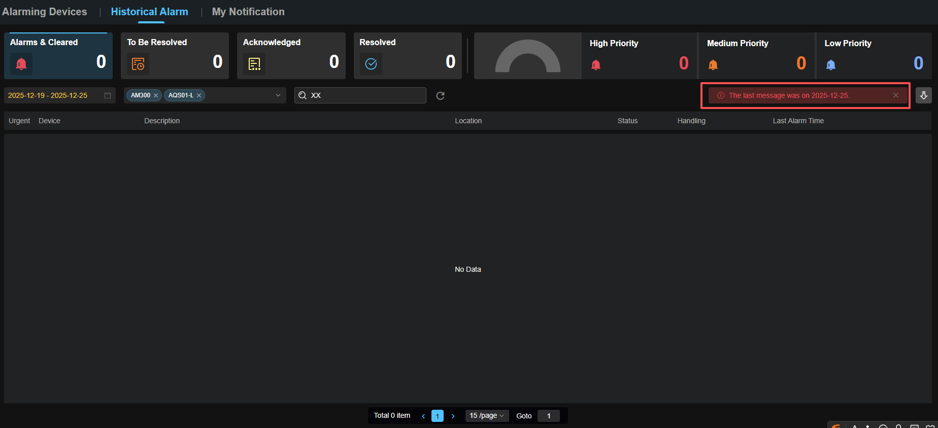 此模块集中展示项目中所有告警的完整历史记录。提供多维度的告警统计、支持按时间、设备和优先级进行联动筛选,并支持生成可下载的告警报告,方便用户对告警问题进行回溯、分析与归档。