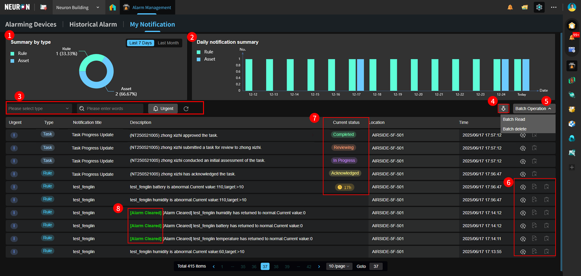 消息当前状态:展示各消息类型当前状态,如 “Rule” 类型消息展示已告警时长;“Task” 类型消息展示工单状态;