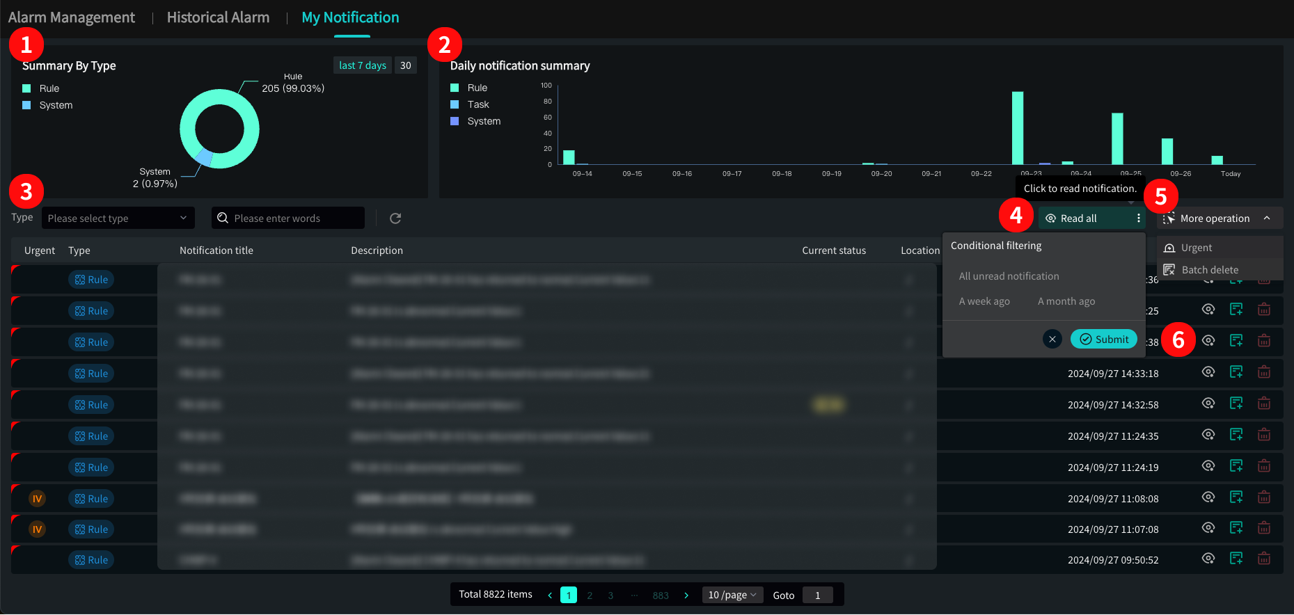 报警管理我的消息我的消息 本页面展示当前登录用户收到的全部消息记录 根据类型汇总当前用户的账号 展示近15天的不同类型消息的堆叠图 可根据类型, 消息标题进行模糊查询 支持批量已读功能 批量删除功能 功能按钮: 查看消息, 提交工单, 删除消息