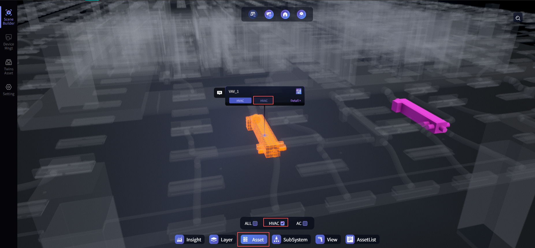 - 若您安装了【资产管理应用】,也可以在资产详情页中查看该资产的三维模型场景,详情操作请查看数字孪生资产详情。