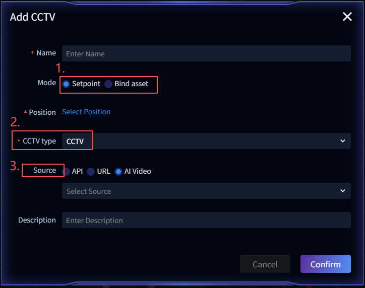 CCTV资产名称自定,新增方式可选择 1.添加点位或绑定资产 进行新增,2.CCTV类型选择【CCTV】,3.数据来源需要选择【AI video】,下拉选择数据。