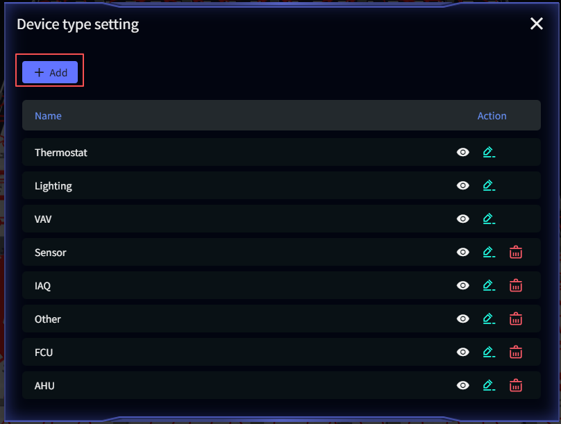 新增资产设备前需预先设定设备类型。请通过左侧菜单栏点击【设置】-【设备类型设置】,点击 +Add 按钮新增。