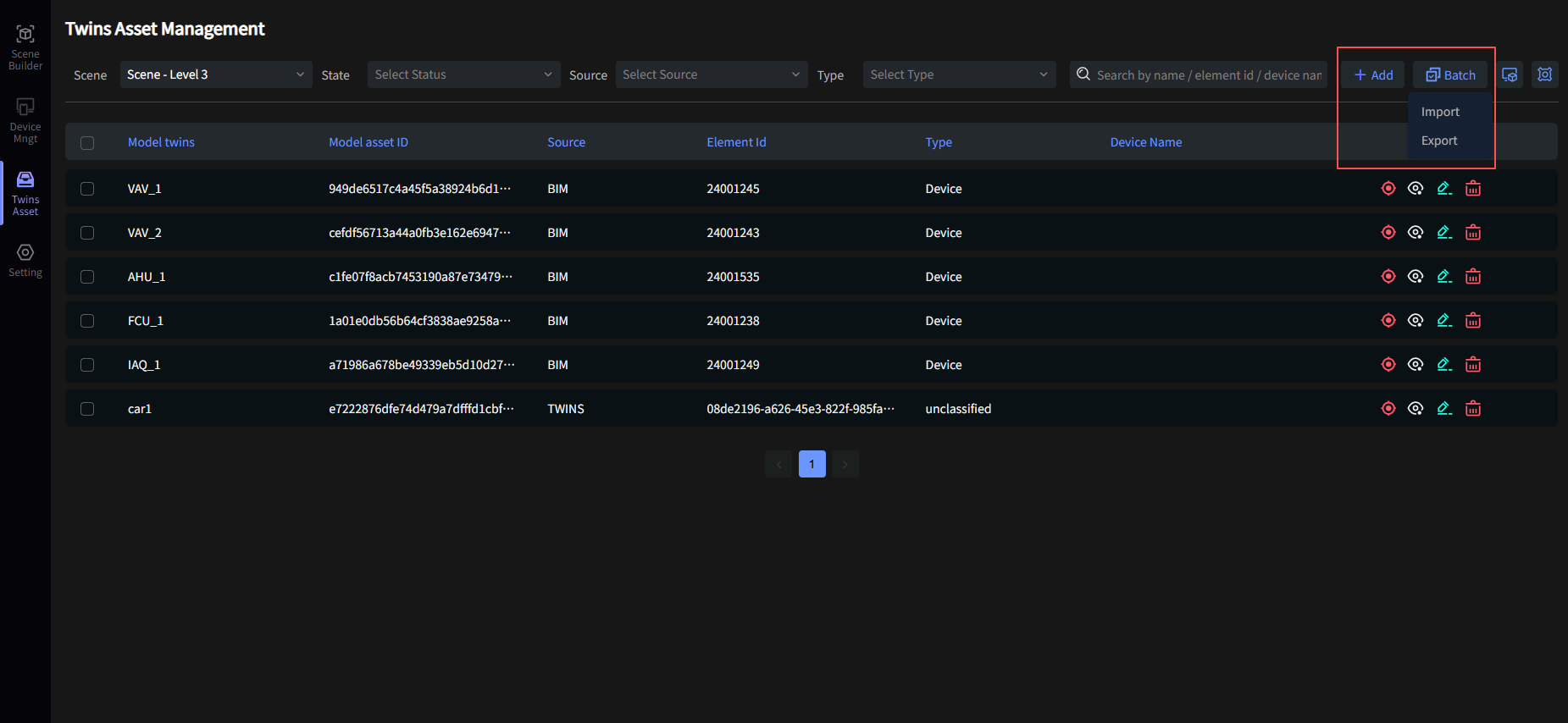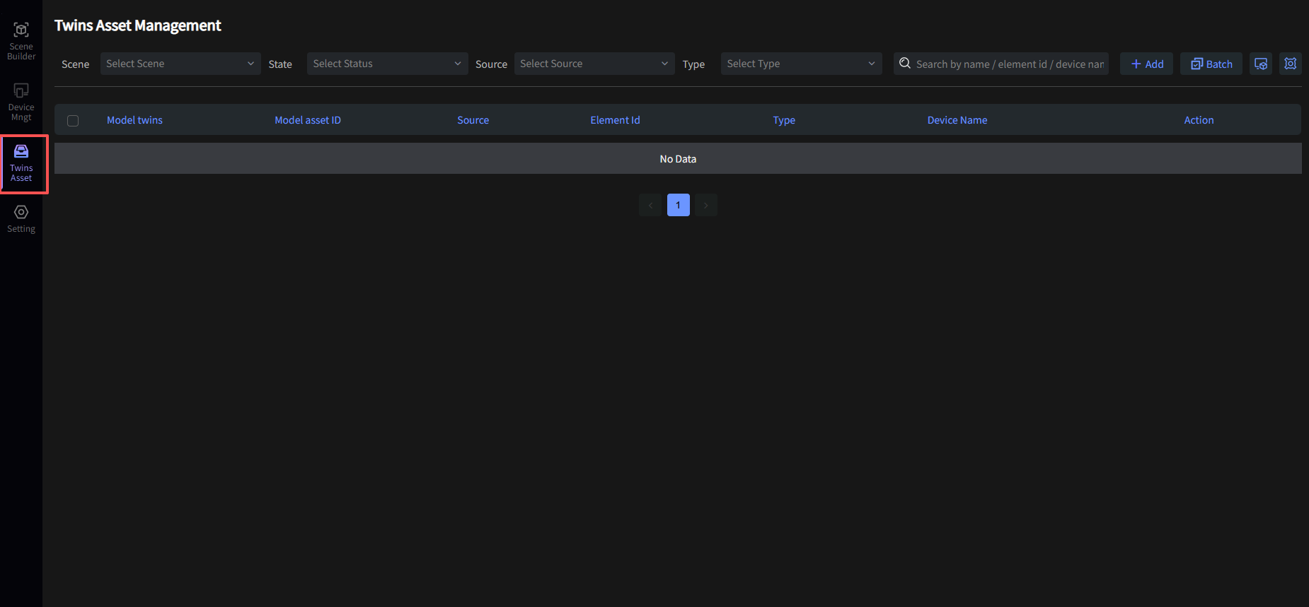 进入应用后,点击左侧菜单栏 “Twins Asset”,查看孪生资产管理页面: