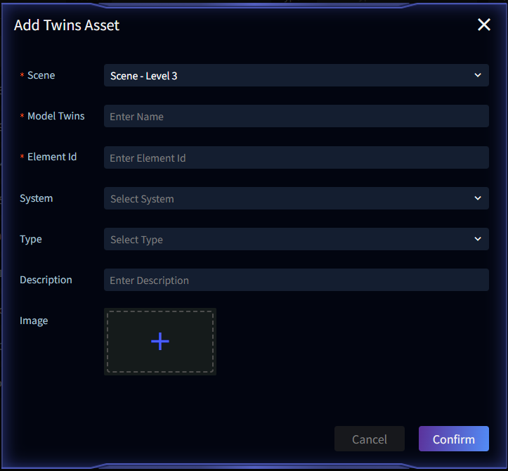 孪生资产管理页面右上角可以看到 +添加 和 批量 两个按钮;点击 +添加,进入孪生资产单个新增页面: