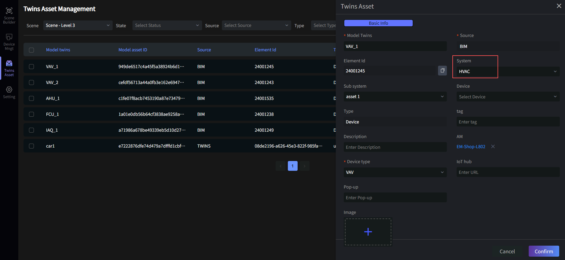 若需在三维场景中查看资产的详细信息(包括基础信息、规格文档、维保记录及工单状态等),需将孪生资产与资产管理模块(Asset Management,简称AM)中的对应资产进行绑定。