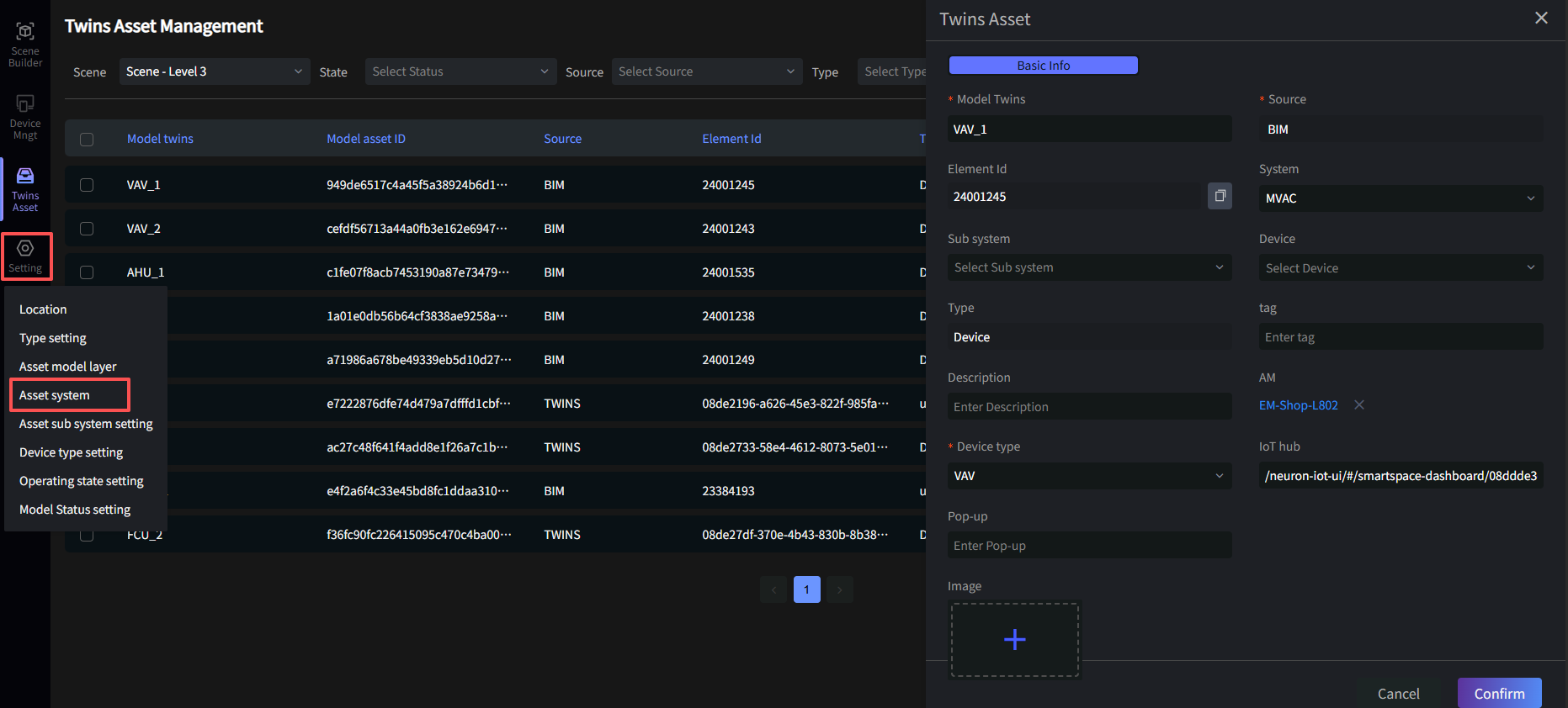 若需在三维场景中查看资产的详细信息(包括基础信息、规格文档、维保记录及工单状态等),需将孪生资产与资产管理模块(Asset Management,简称AM)中的对应资产进行绑定。