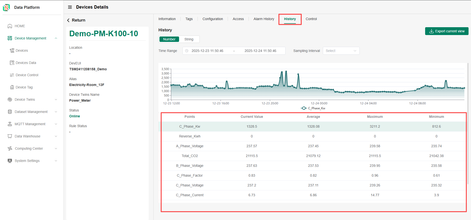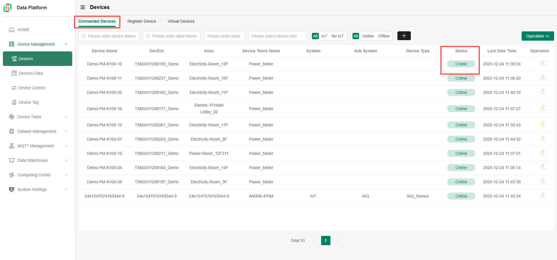 预期结果:进入数据中台->设备管理->新增设备成功后, 并根据教程正确配置成功后,当设备数据上报至平台时,其将出现在设备列表中,状态显示为“在线”,您可在设备详情页中看到实时刷新的设备数据(如电压、电流、功率、用电量)。
