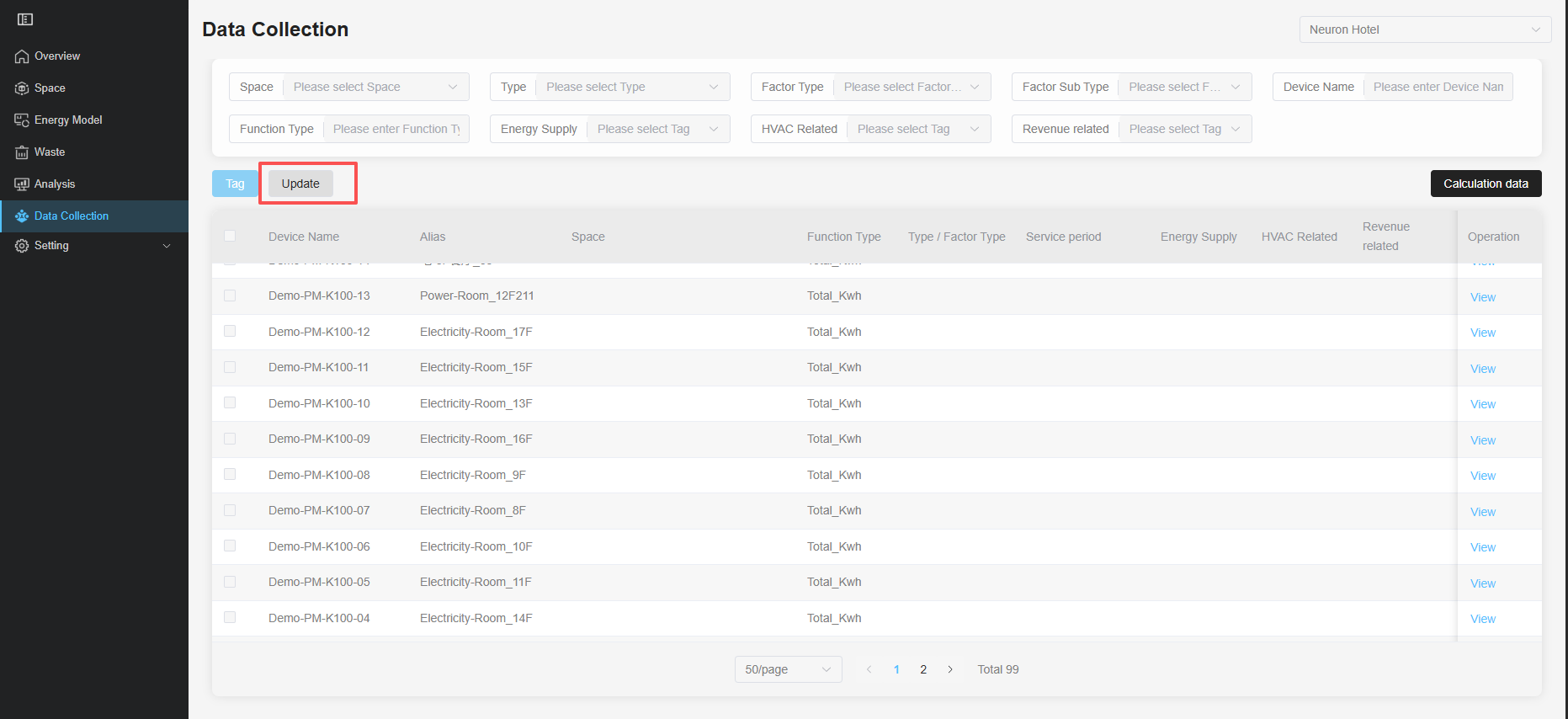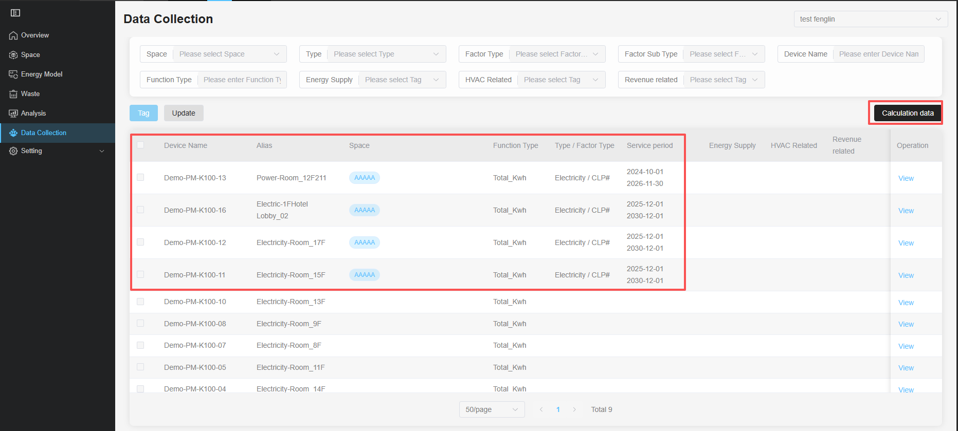 - 预期结果:进入Energy -> 数据采集,对设备数据绑定空间、服务周期和类型等标签,完成后点击 “计算数据” 按钮以生成分项能耗统计。