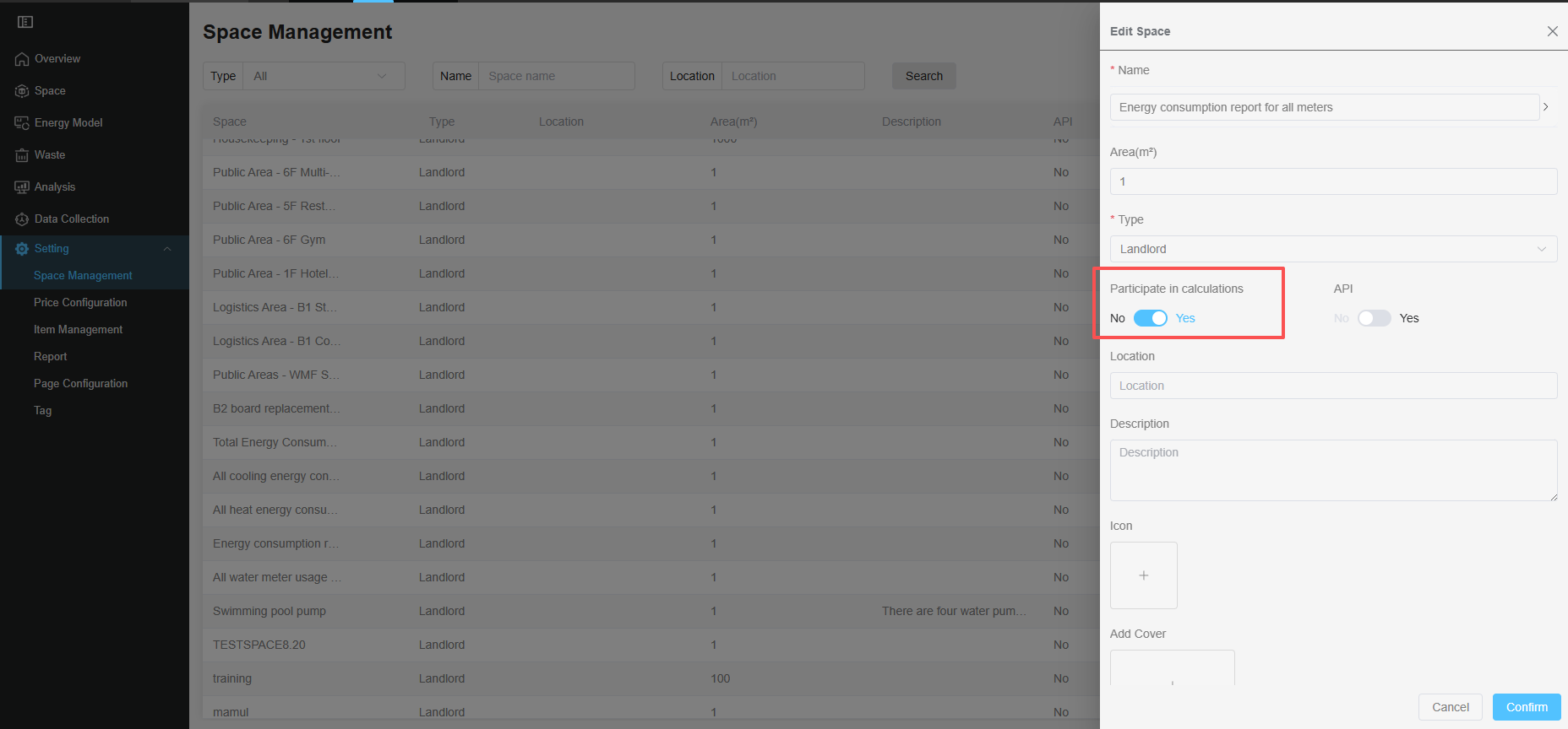 - 预期结果:进入Energy -> 空间管理,已创建需要参与分析的 Space,并选择 Space 是否参与项目的数据总数计算。