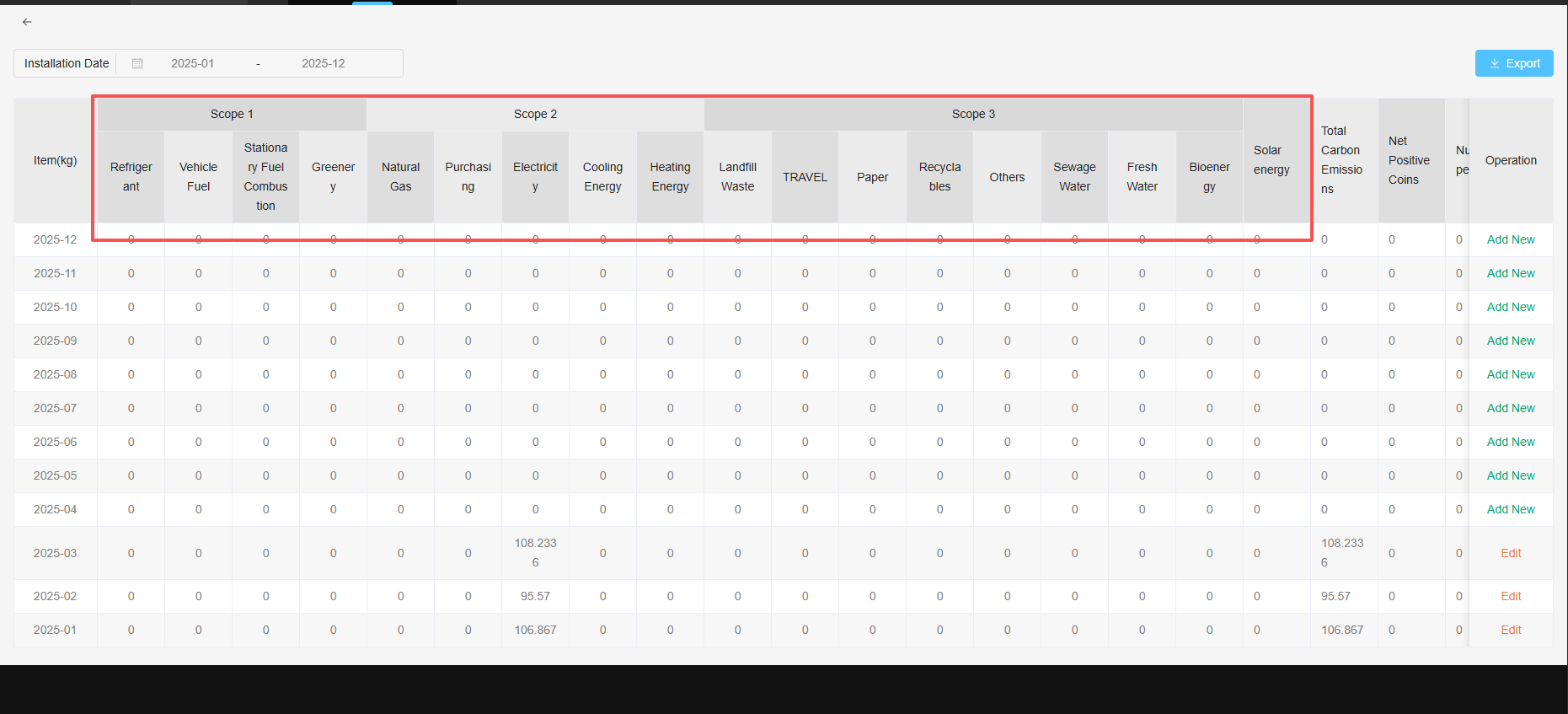 预期结果:进入 Energy 应用,选择对应空间(Space)查看到相关能耗数据记录,且能够完成数据(如用电量、碳排放)的手动录入。