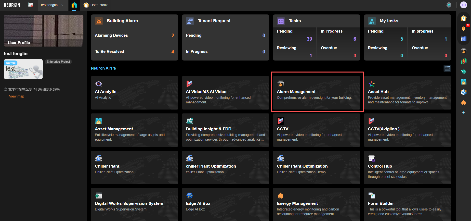 瀏覽器存取平台管理員提供的官方URL,使用您的帳號直接登入。進入您的專案,在專案首頁的應用列表找到 “Alarm Management”。