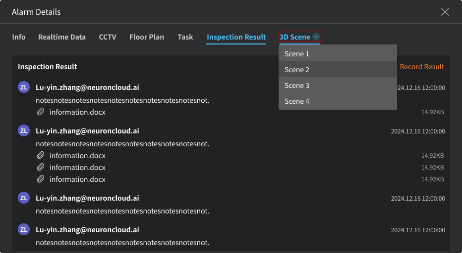 展示告警設備在數位孿生場景上的定位;當存在於多個場景時,點擊箭頭查看全部場景列表。