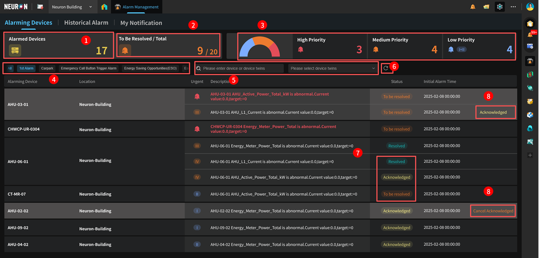 本頁面即時展示專案內處於告警狀態的設備與相關消息,告警處理遵循標準流程,包含待解決、已確認、已解決三種狀態,支援自動與手動處理方式,旨在實現告警的高效追蹤與閉環管理。