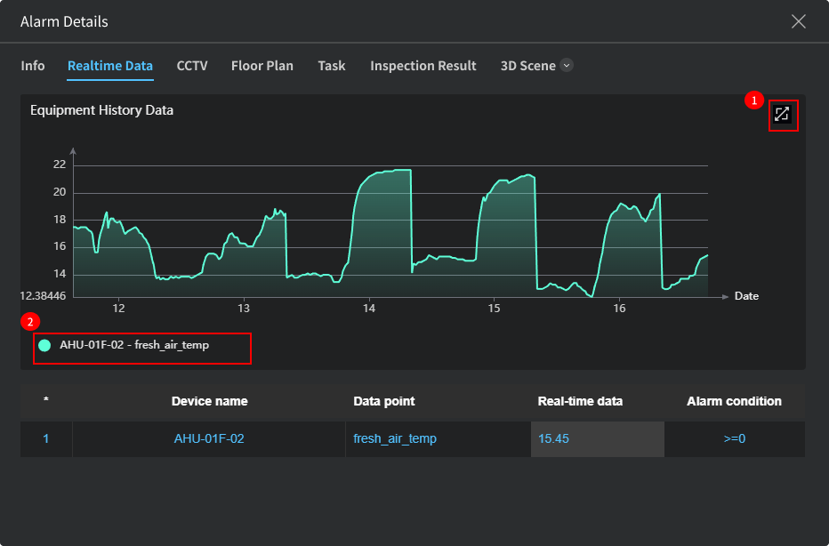 用於展示告警設備的即時資料,上方展示資料曲線圖,下方展示資料表格,其中: