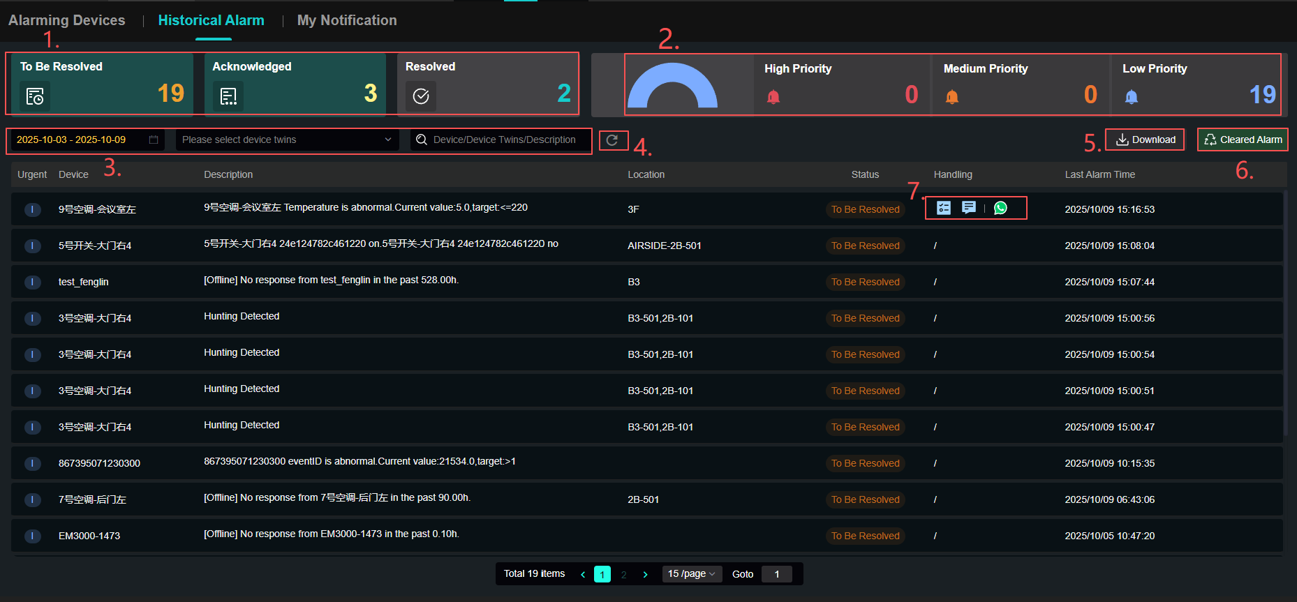 使用者可以透過時間、物模型、設備名稱等關鍵字進行篩選,並且可與訊息緊急度、警報訊息總數進行聯動查詢。