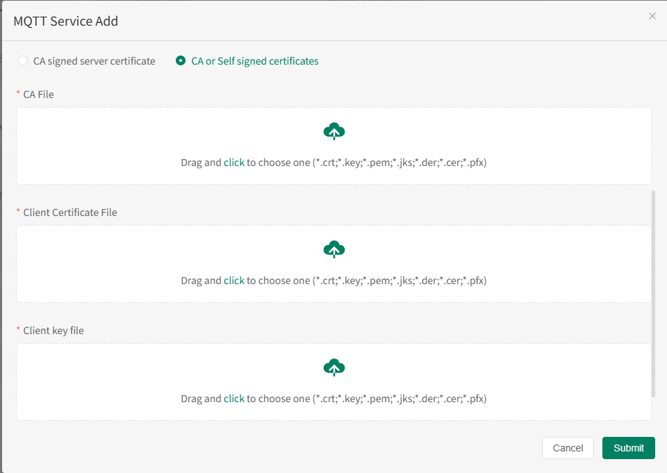 在左側菜單點擊 MQTT 管理 - MQTT 服務器,查看系統內已存在的 MQTT 服務器。點擊 添加 按鈕可新增您的 MQTT 服務器。