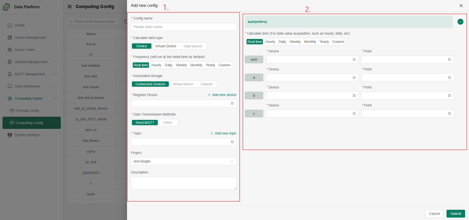 - 設備名稱:註冊新設備或填寫一個已連接設備的device name(適用於將二次計算後的數據作為該已連接設備的point展示,device name需要全匹配,可點擊搜尋查詢已有設備);