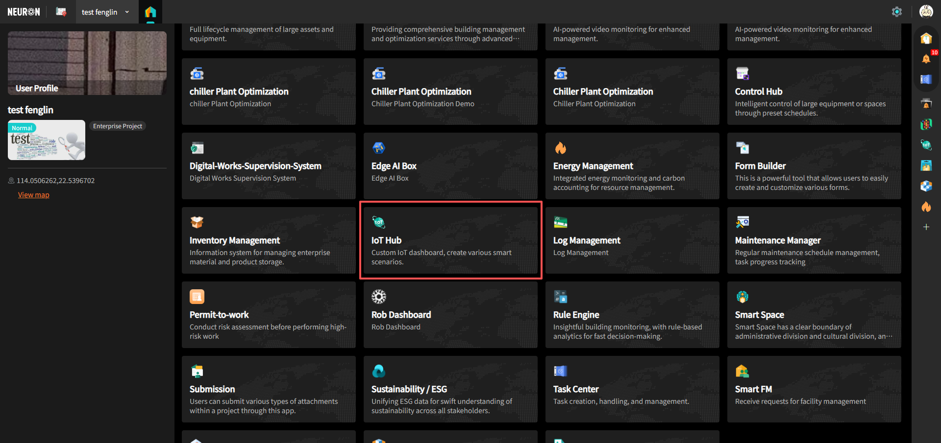 瀏覽器存取平台管理員提供的官方URL,使用您的帳號直接登入。進入您的專案,在專案首頁的應用列表找到 「IoT Hub」。