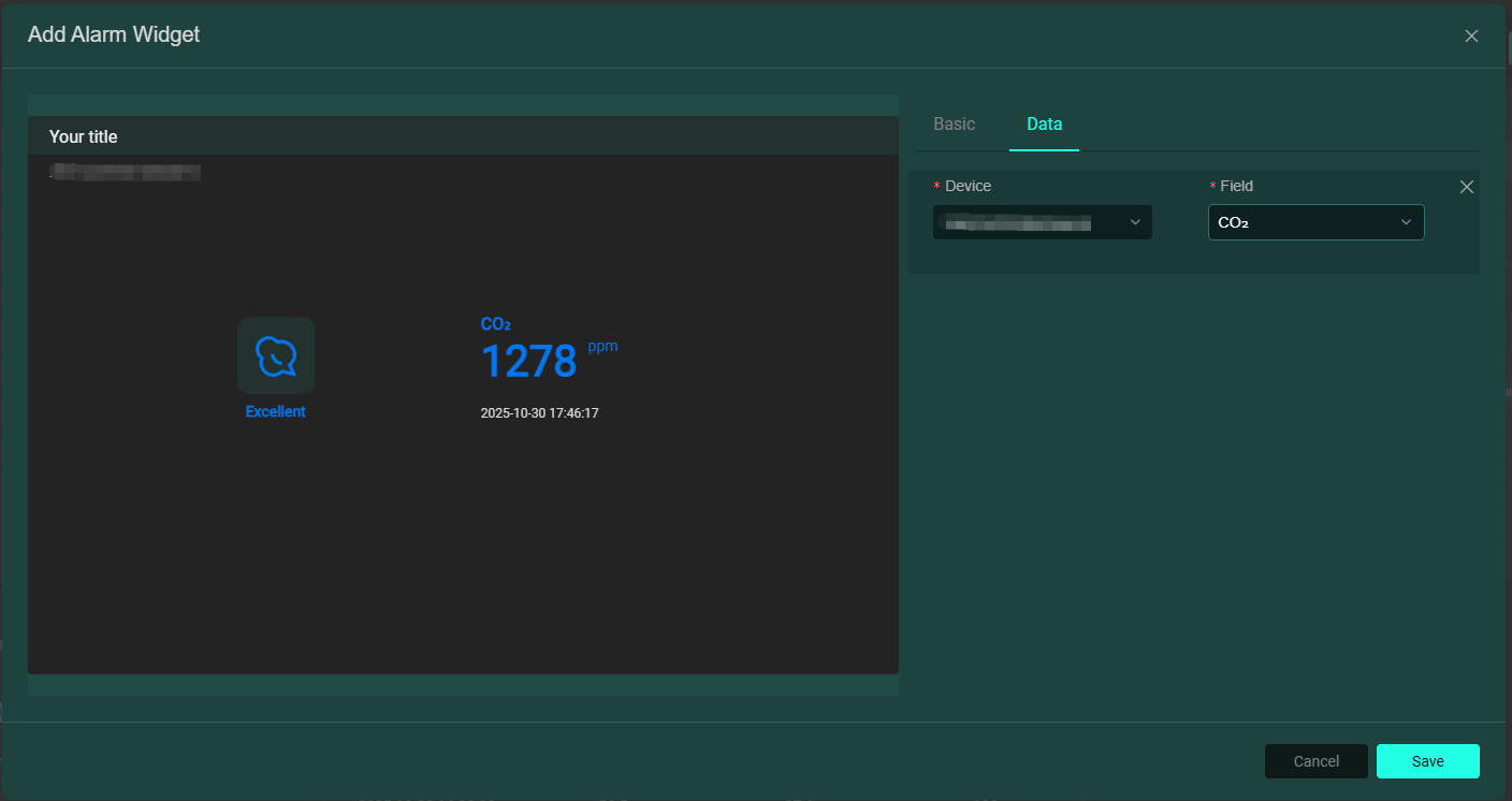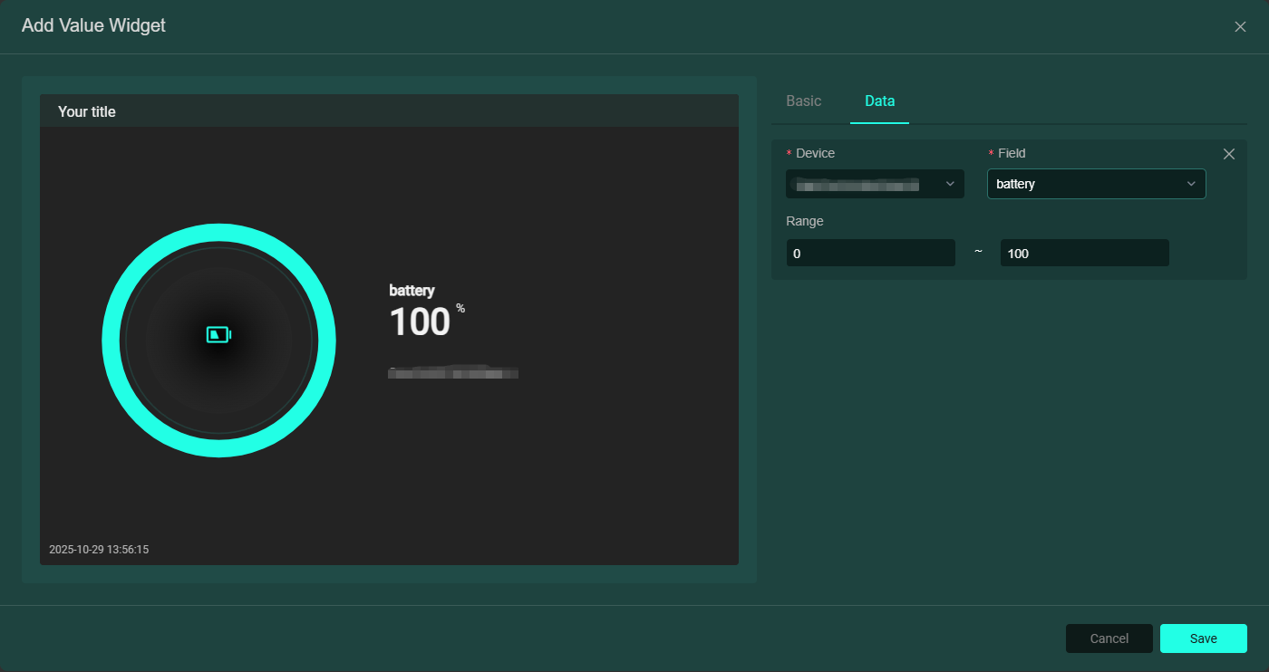 • 數值卡片:用於展示設備數值。可在基礎欄輸入標題,選擇數值表現樣式;資料欄新增設備及其相關欄位,如下圖: