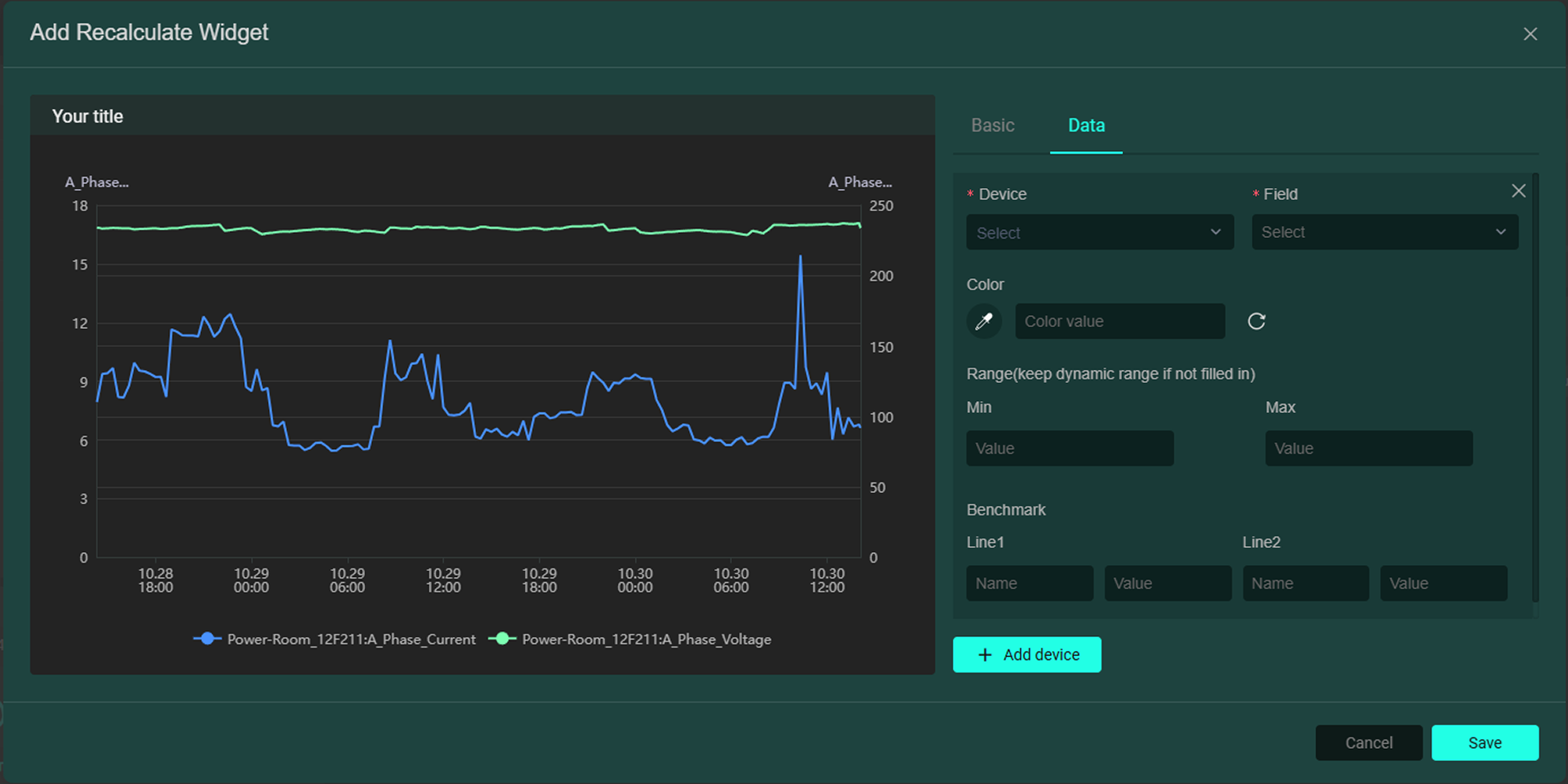 • 特殊圖表卡片:以圖表形式展示設備資料,不同於【3. 圖表卡片】的是,該圖表適用於已經配置了二次計算的設備。可在基礎欄輸入標題,選擇圖標表現樣式、資料時間範圍(彈性/固定時間);資料欄新增設備及其相關欄位,可新增多個設備欄位,如下圖: