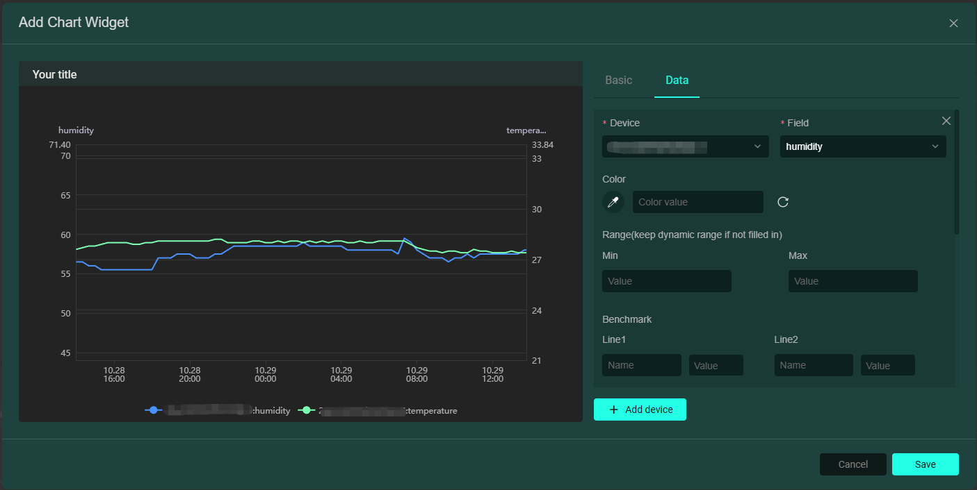 • 圖表卡片:以圖表形式展示設備資料。可在基礎欄輸入標題,選擇圖標表現樣式、資料時間範圍(彈性/固定時間);資料欄新增設備及其相關欄位,可新增多個設備欄位,如下圖: