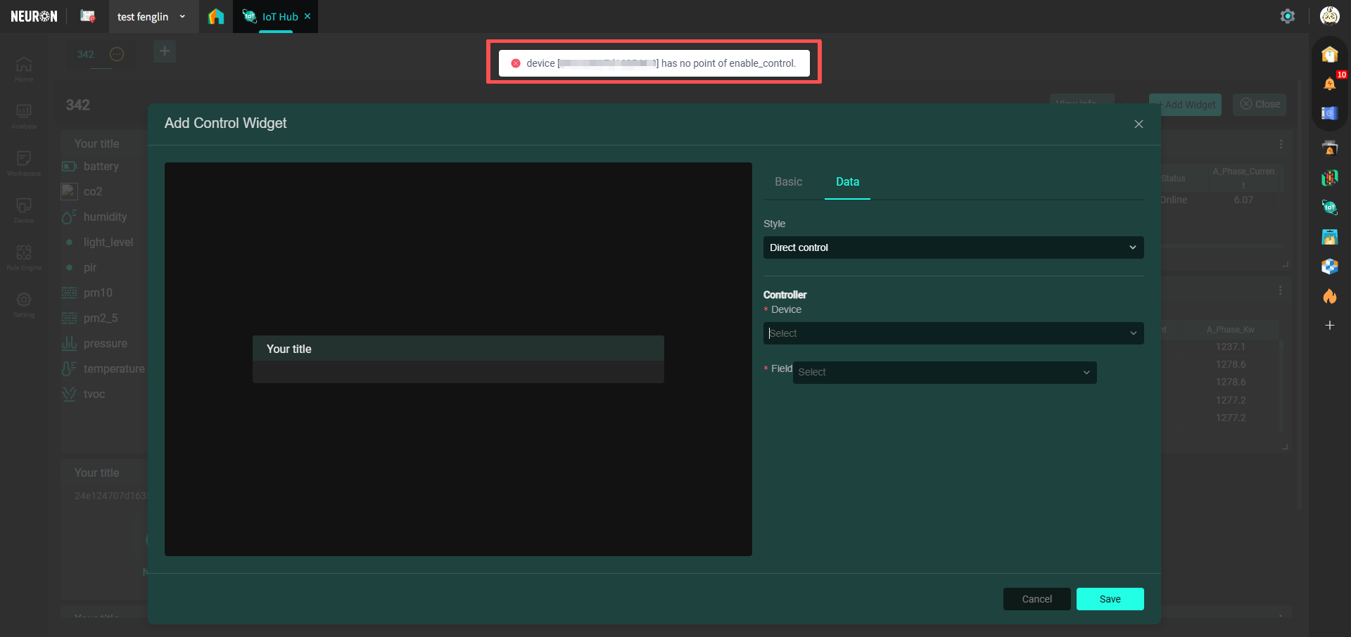 • 控制卡片:用於控制可反控的設備(如,開關、電子鎖)。在資料欄新增設備及其相關欄位,如若新增的設備並未配置反控,則會出現圖中報錯彈框,如下圖: (如需進行反控配置可移步 設備反控 )。