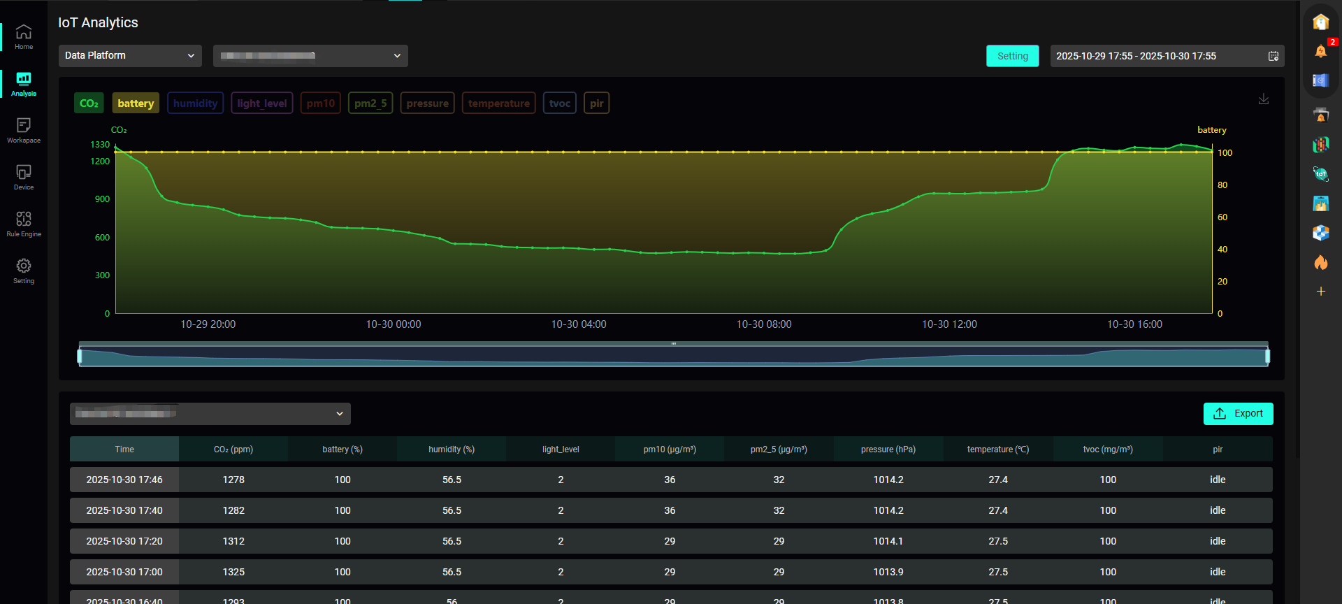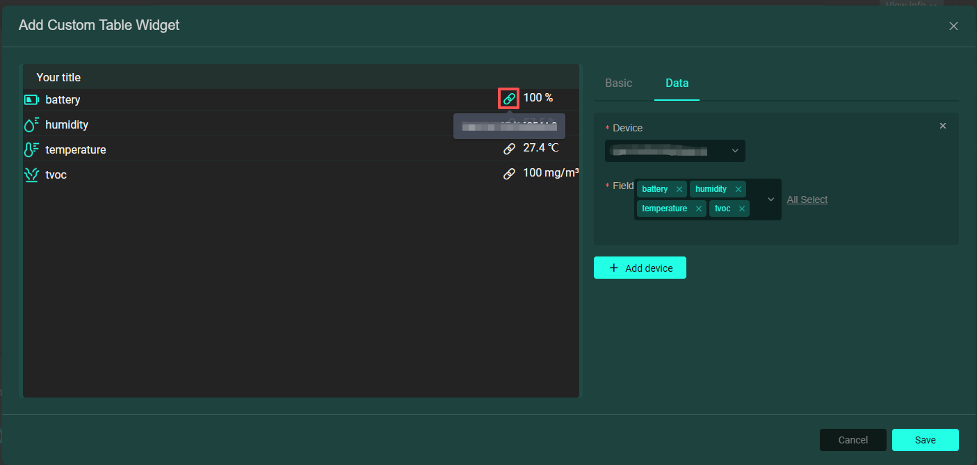 • 自訂表格卡片(詳情卡片):用於展示設備資料詳情。透過從資料欄新增設備及其相關欄位產生一個自訂表格,滑鼠移動至連結按鈕可檢視設備名稱,點擊可跳轉至該設備的設備分析介面,如下圖: