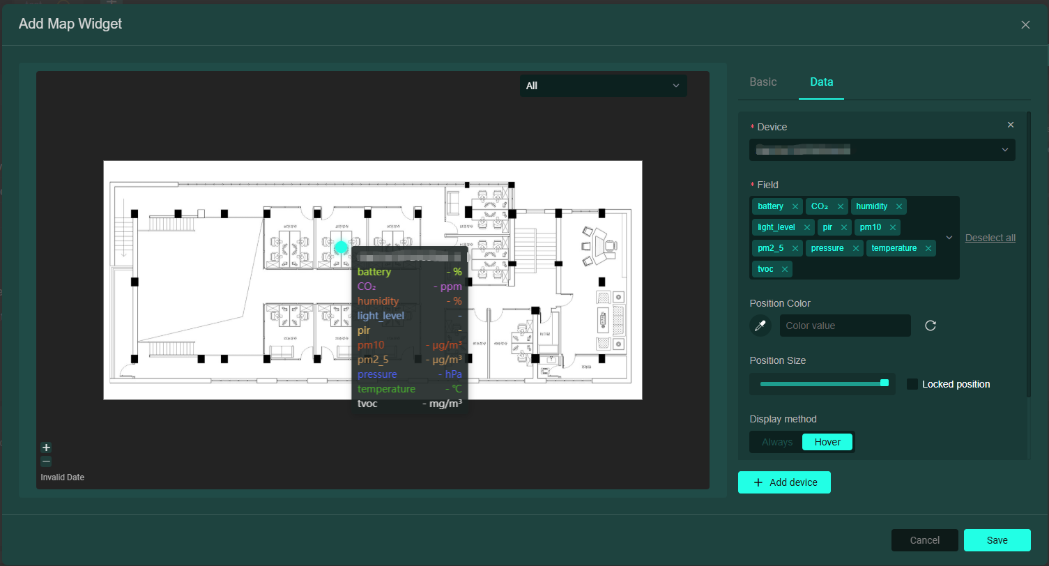• 地圖卡片:可上傳一張圖片(如位置劃分圖)作為地圖,在資料欄新增設備及其相關欄位,可產生一個圓點預覽設備資料(可上傳多個設備,即有多個圓點),如下圖: