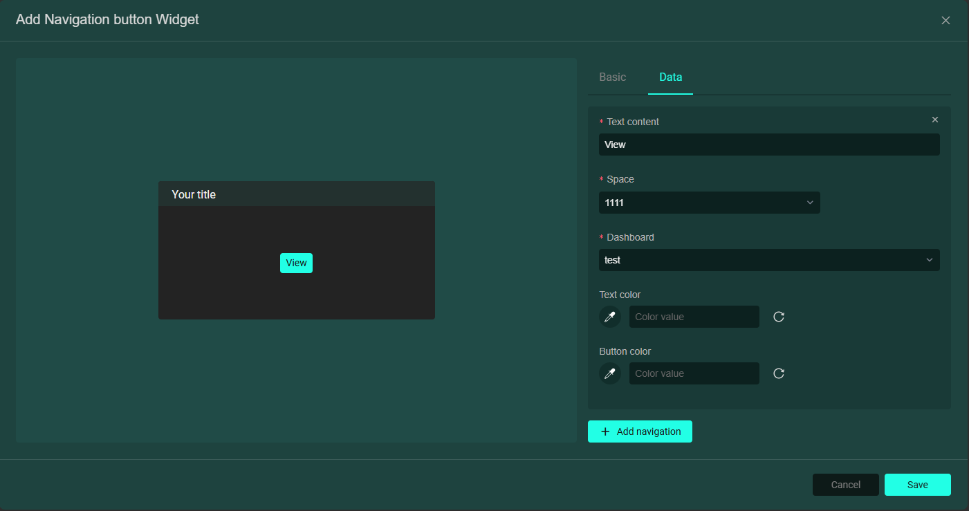 • 導航卡片:用於實現從該看板向其他空間看板進行快速跳轉。在資料欄輸入導航按鈕的文字,選擇任意空間以及該空間下的任意看板,如下圖: