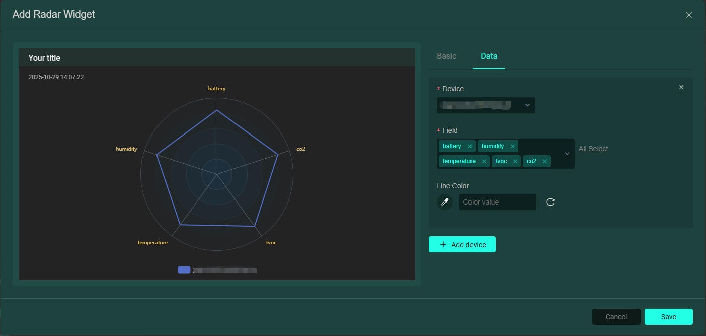 • 雷達圖卡片:以雷達圖的樣式展示設備資料。可新增多個設備欄位,如下圖: