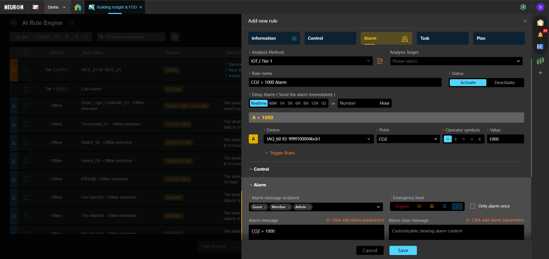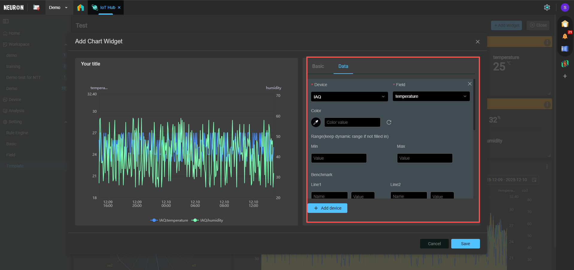 本指南提供以室內空氣品質監測設備(Indoor Air Quality)為例的IoT感測器接入 Neuron 平台的設定流程。跟著步驟走,透過完成設備入網、資料解析、監控看板建立及告警規則配置等關鍵步驟,可實現即時監測會議室等空間的溫濕度、CO₂等關鍵指標,及時掌握環境狀況並主動告警,從而有效保障人員健康,直觀展示環境監測服務的價值。